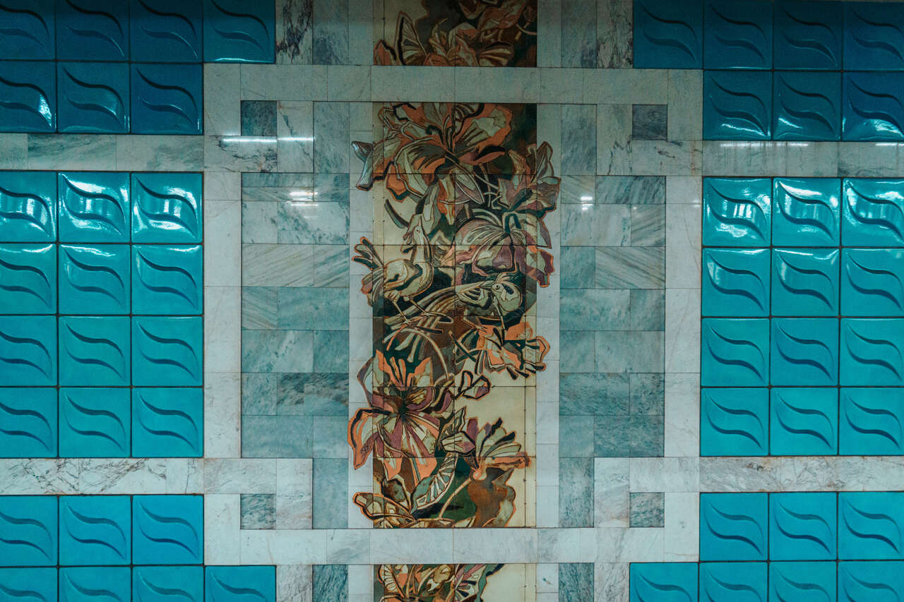 It's beautiful green mosaic tiles, paintings of trees and plants, and the blue-colored train go perfectly well with the fact that this is a metro station named after the Botanical Garden of the Kharkiv University above it.
