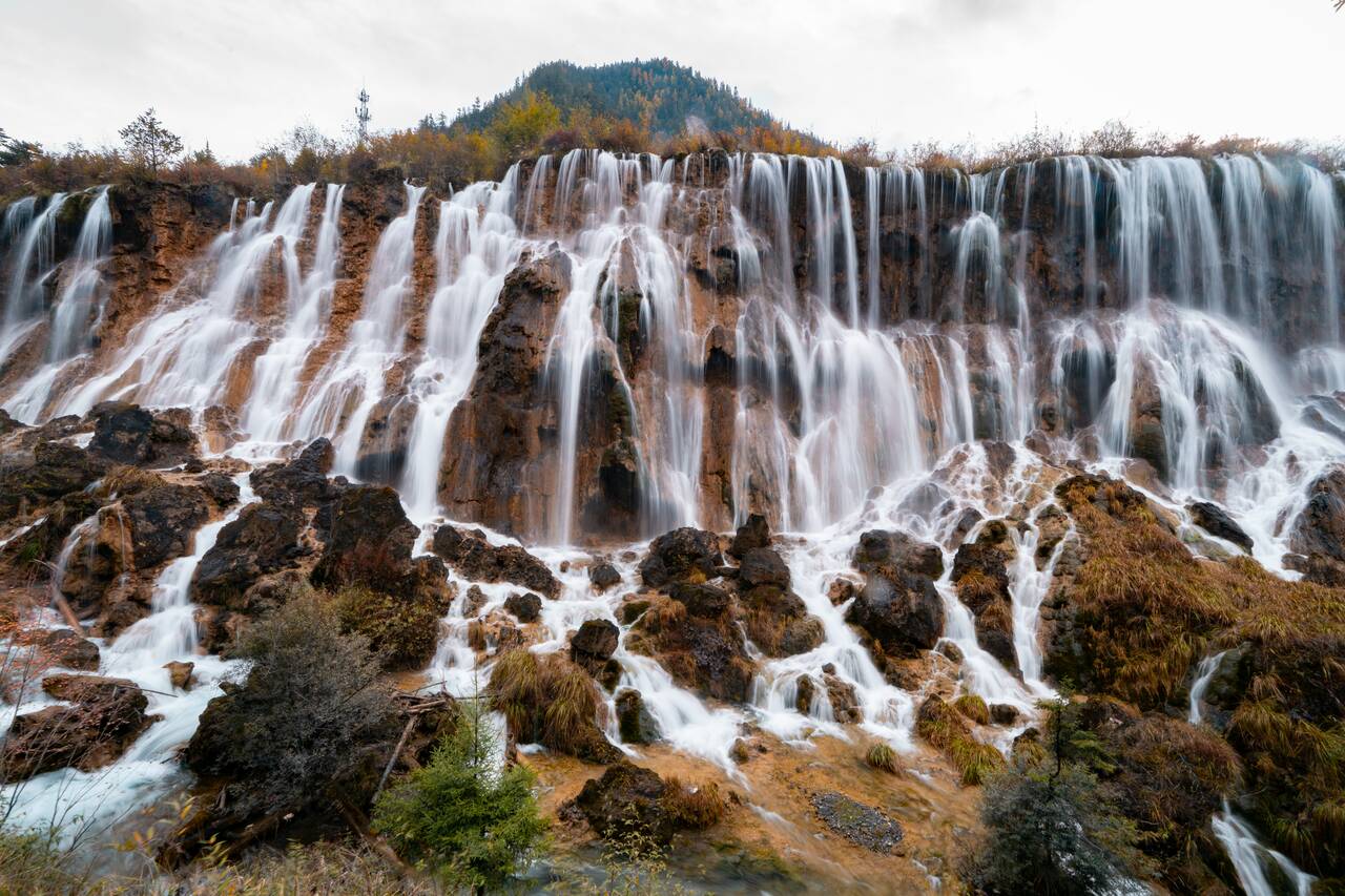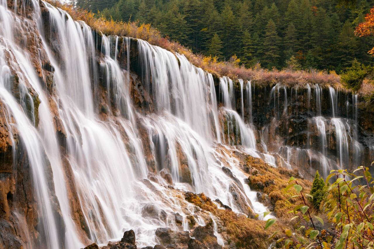 Just downstream from Five-Flower Lake lies the famous Pearl Shoal. It is a broad travertine platform formed by the deposition of calcium carbonate, with shallow water flowing gently over its surface. When the water flows over the uneven surface, it creates countless sparkling droplets that glisten under the sun like strings of pearls, hence the name Pearl Shoal.