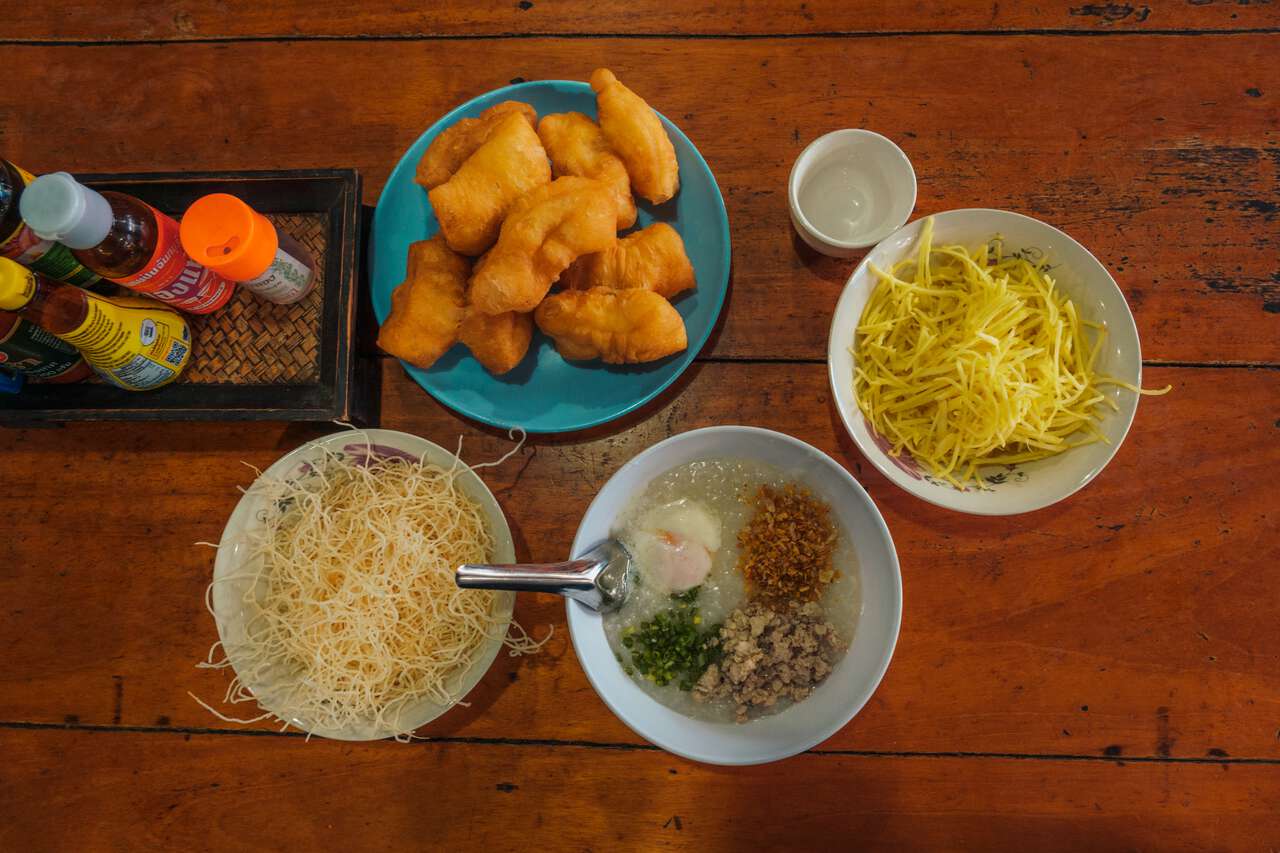 One of the first things I do when I wake up in Sangkhlaburi is to cross the Mon bridge and have the traditional Mon congee with crispy dough sticks (Patongo) at the Mon Restaurant (ร้านอาหารมอญ), one of the best breakfast places in Sangkhlaburi.