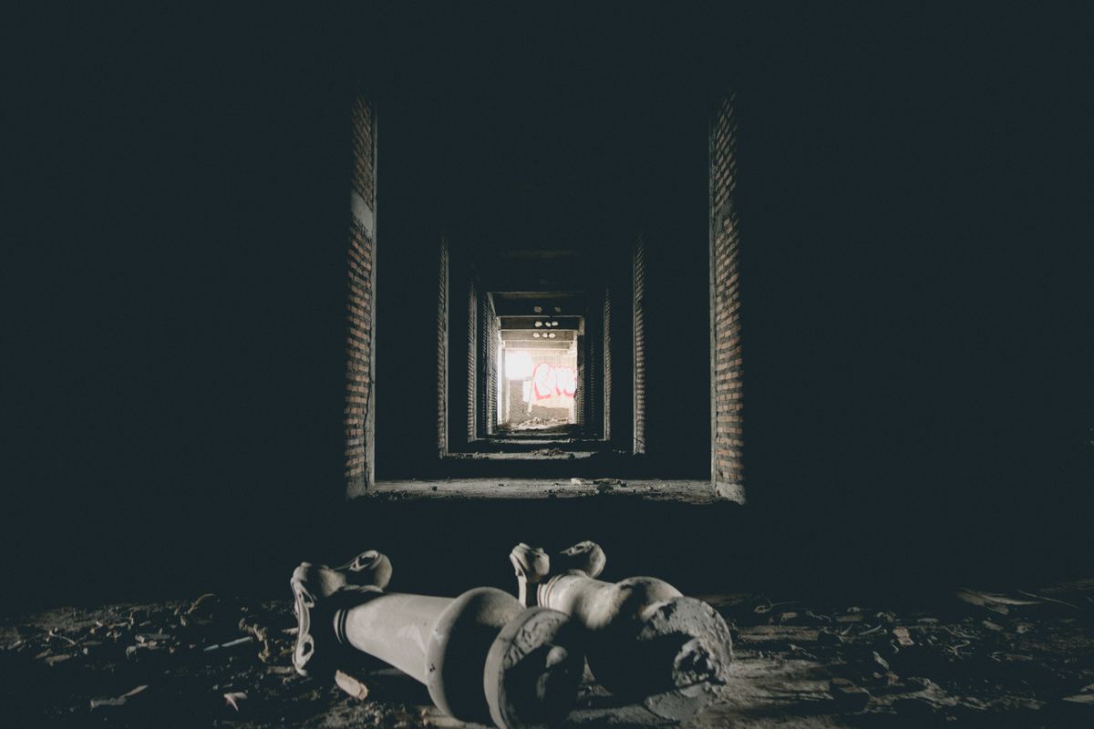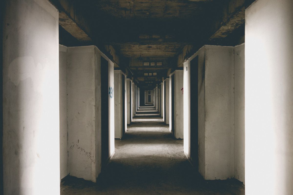 After walking up the pitch-black stairways with our flashlights, we came across multiple of these corridors. I believe these were the residential suites.