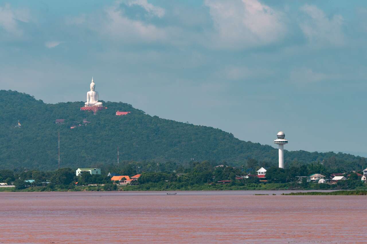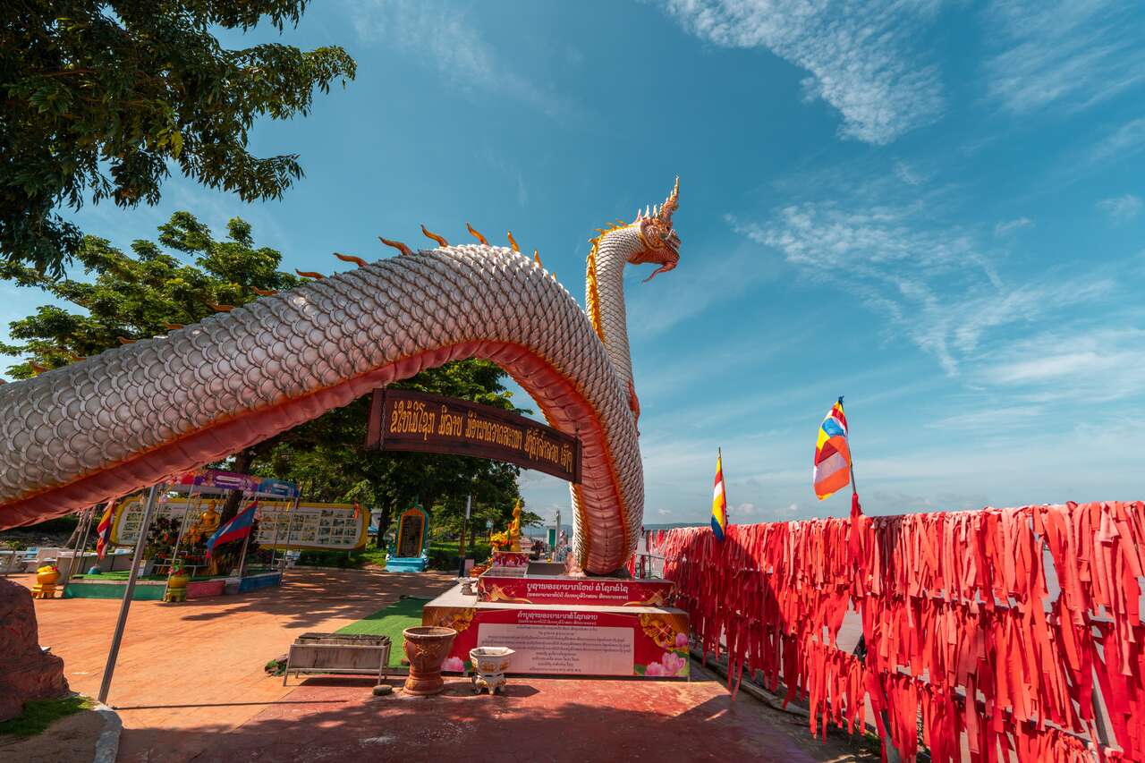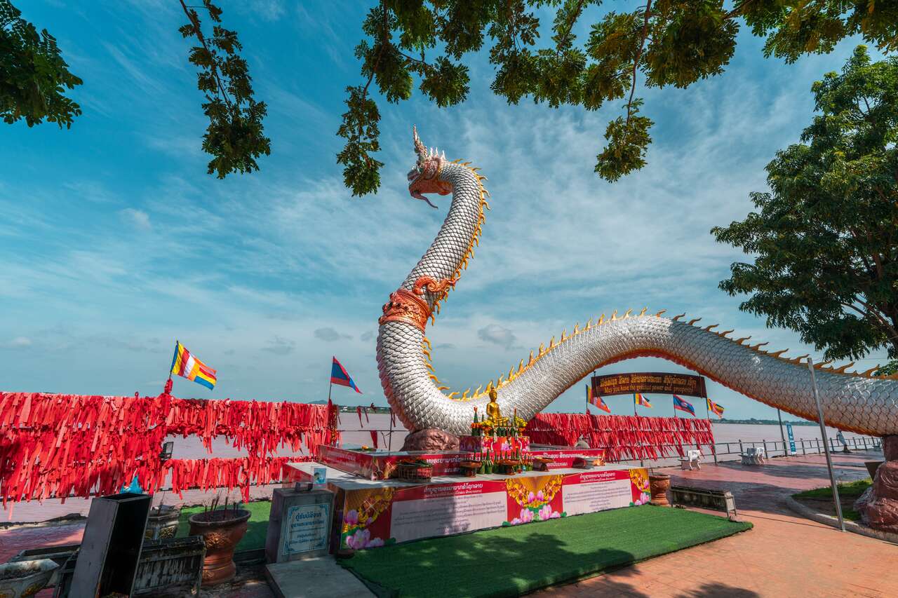 At the naga statue, you can buy flowers and incense to pray for good fortune at a nearby shrine, or simply stroll along the lovely riverside promenade and admire the stunning view of Mukdahan, complete with its UFO-shaped observation tower and the white Buddha image on the mountain across the Mekong.