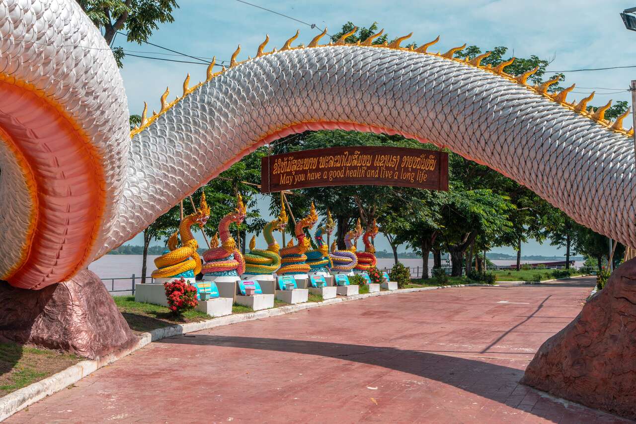 We begin this list with one of my favorite things about Savannakhet: its beautiful laid-back vibe of the riverside promenade that runs along the Mekong River. Here you will find the beautiful Naga Statue, a massive white-and-gold serpent statue with its body and tail arching dramatically above walkers in the riverside park.
