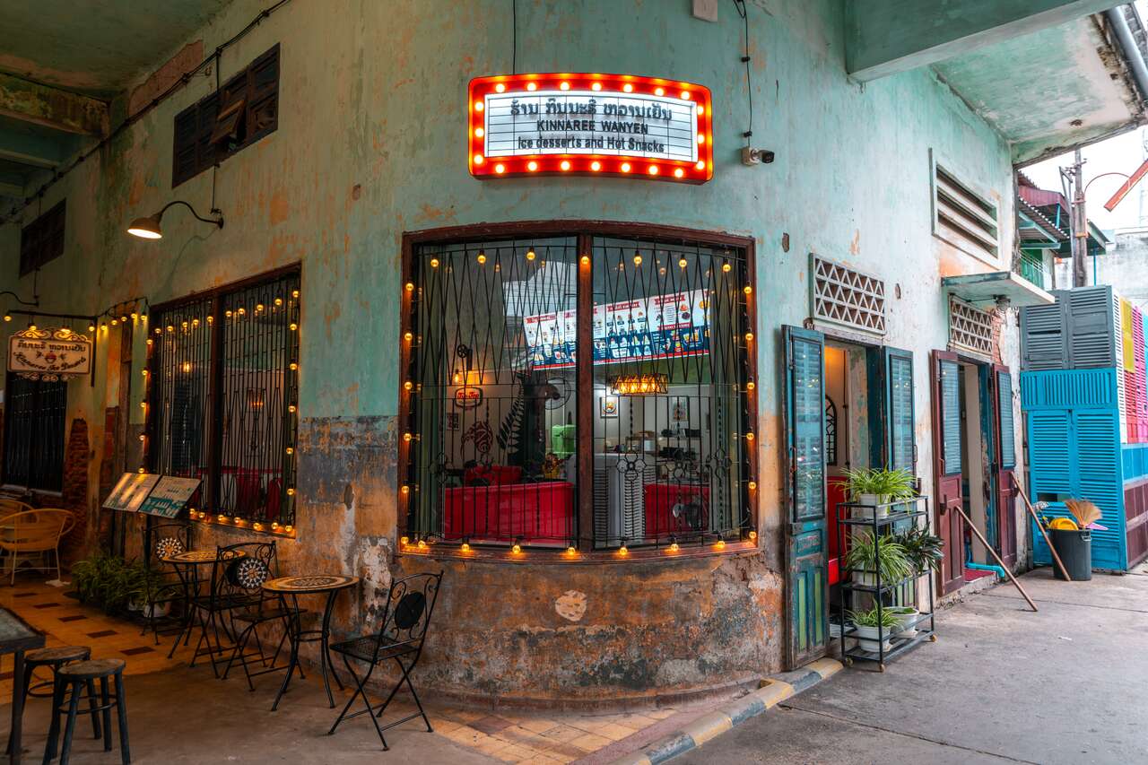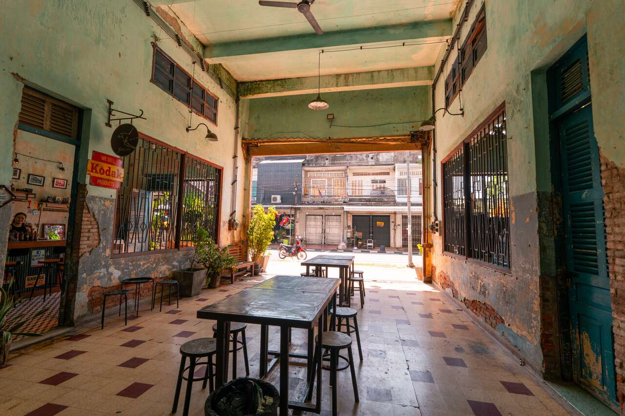 In this area, you’ll find a mix of colonial buildings, some newly renovated, others maintaining a rustic, atmospheric exterior while their interiors have been converted into bars, cafes, or restaurants. I particularly enjoy the buildings around Sooksavan Cafe & Bistro, with its yellow-painted café, and the old theater opposite, featuring a striking brutalist-style façade.