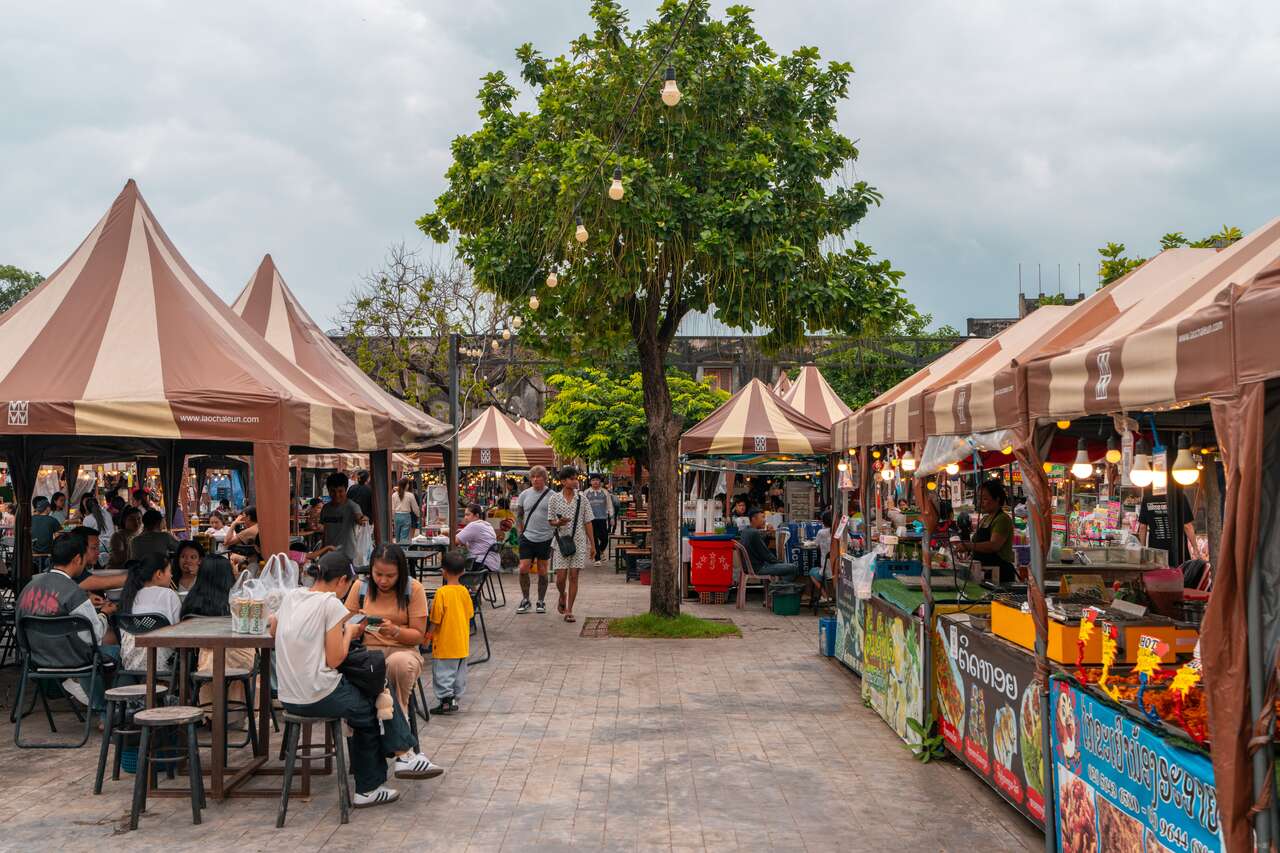 The night market, also known as Savan Mixay Night Market, stretches from behind Theater "Lao Chaleun" all the way to the bank of the Mekong River. Here, you will find not just street food stalls, but all kinds of entertainment for kids, such as bouncing castles and rental carts, that bring the whole area to life.
