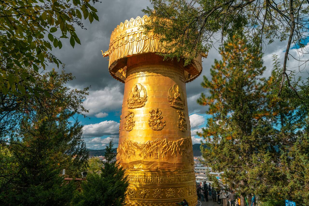 Built in 2002, the wheel was erected to commemorate the renaming of Zhongdian to Shangri‑La. It is made from gold-plated pure copper and richly decorated: the upper portion features carvings of four major Bodhisattvas, enlightened beings who postponed their own nirvana to help all others achieve enlightenment, while the lower part displays the Eight Auspicious Symbols of Buddhism.