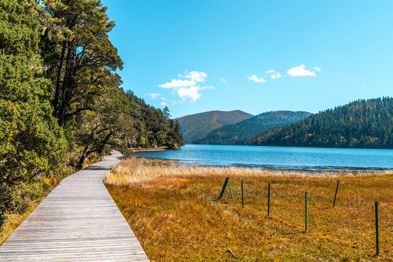The last stop is Bitahai Lake. The bus will need to backtrack to the entrance and take another route around the mountain, so be sure not to get off at the first stop. Once you arrive, you will walk along an elevated walkway for about 15 minutes to reach the lake.