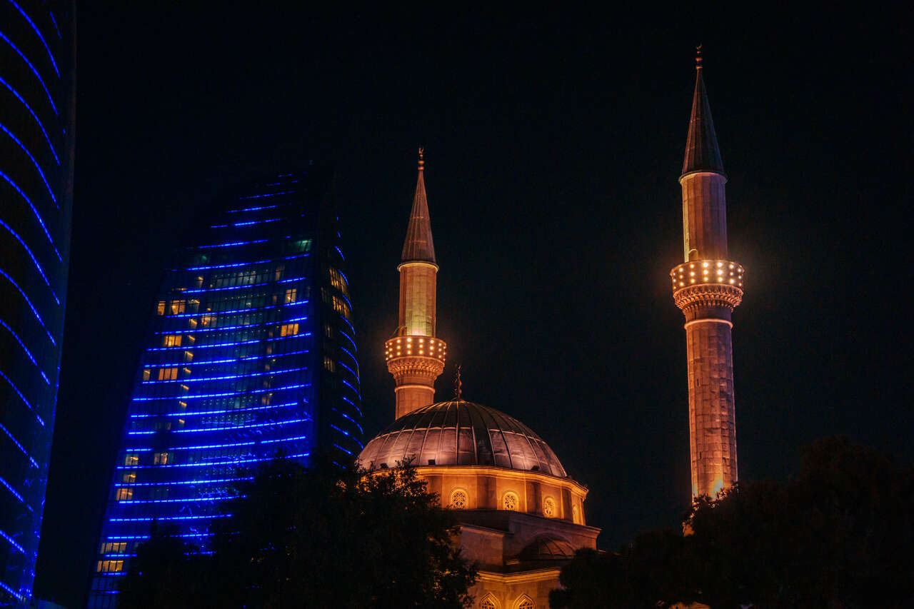 What makes Heydar Mosque so special is how the entire mosque lights up at night, creating a forever calming presence of the mosque that overlooks the quiet neighborhood around the area.