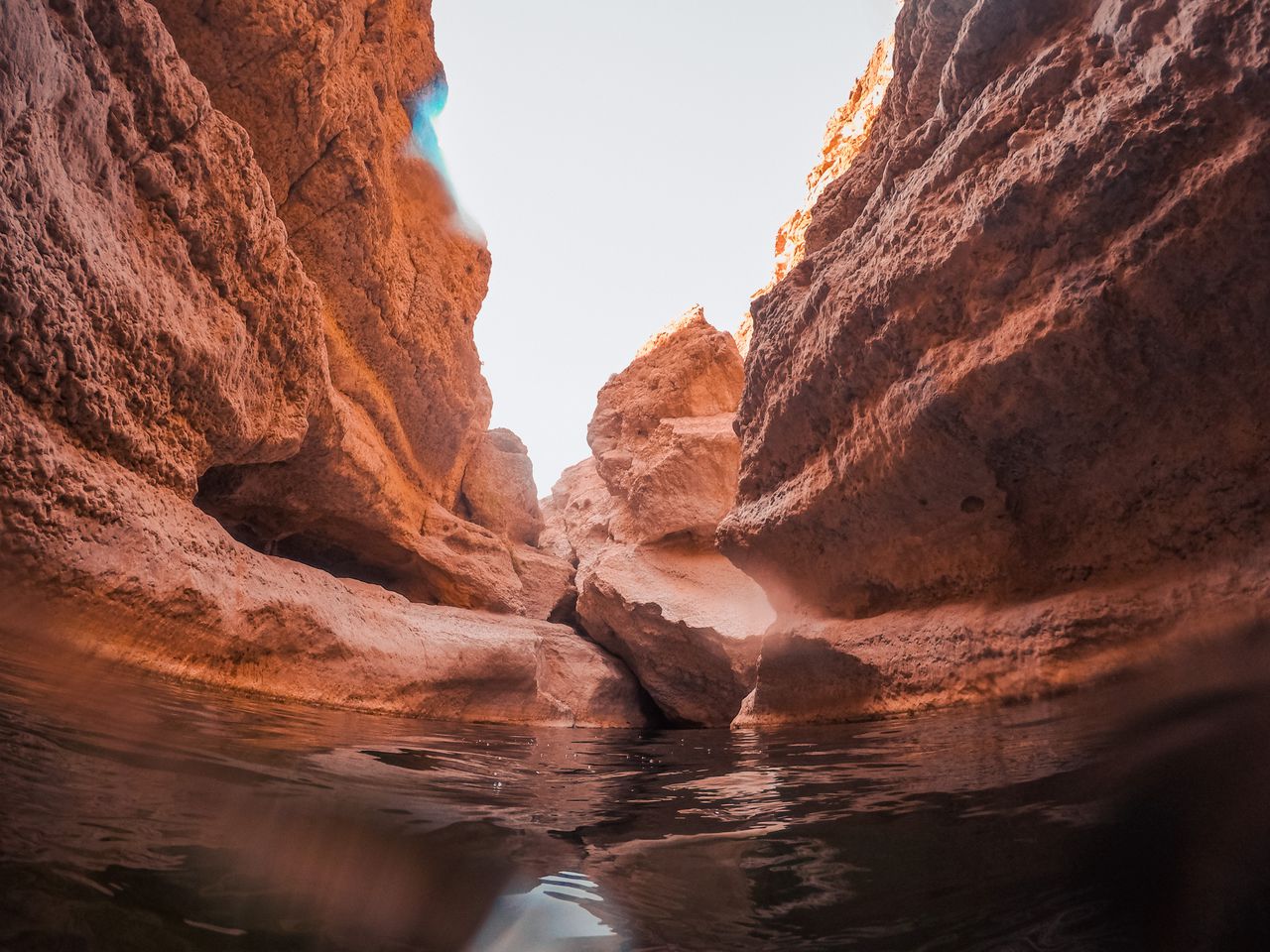 From the gorge, bring your GoPro and your flip-flops and start swimming towards the cave. The path will become shallow again as you swim towards the cave, and this is where the flip-flops come into play.